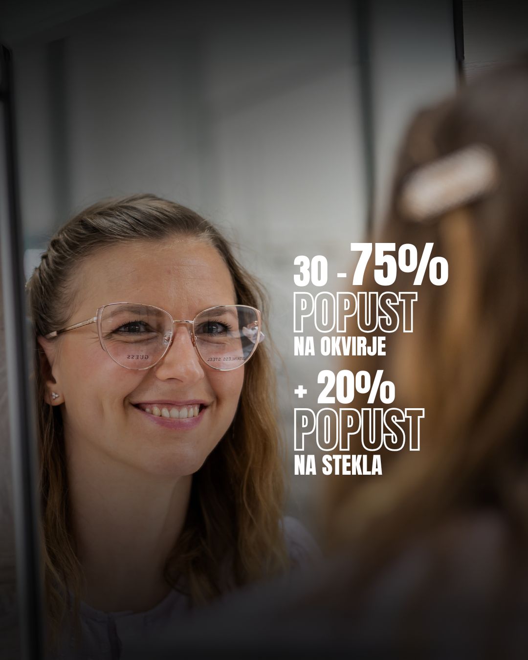 Izkoristite 30–75 % popust na izbrane okvirje in dodatnih 20 % popusta na stekla.